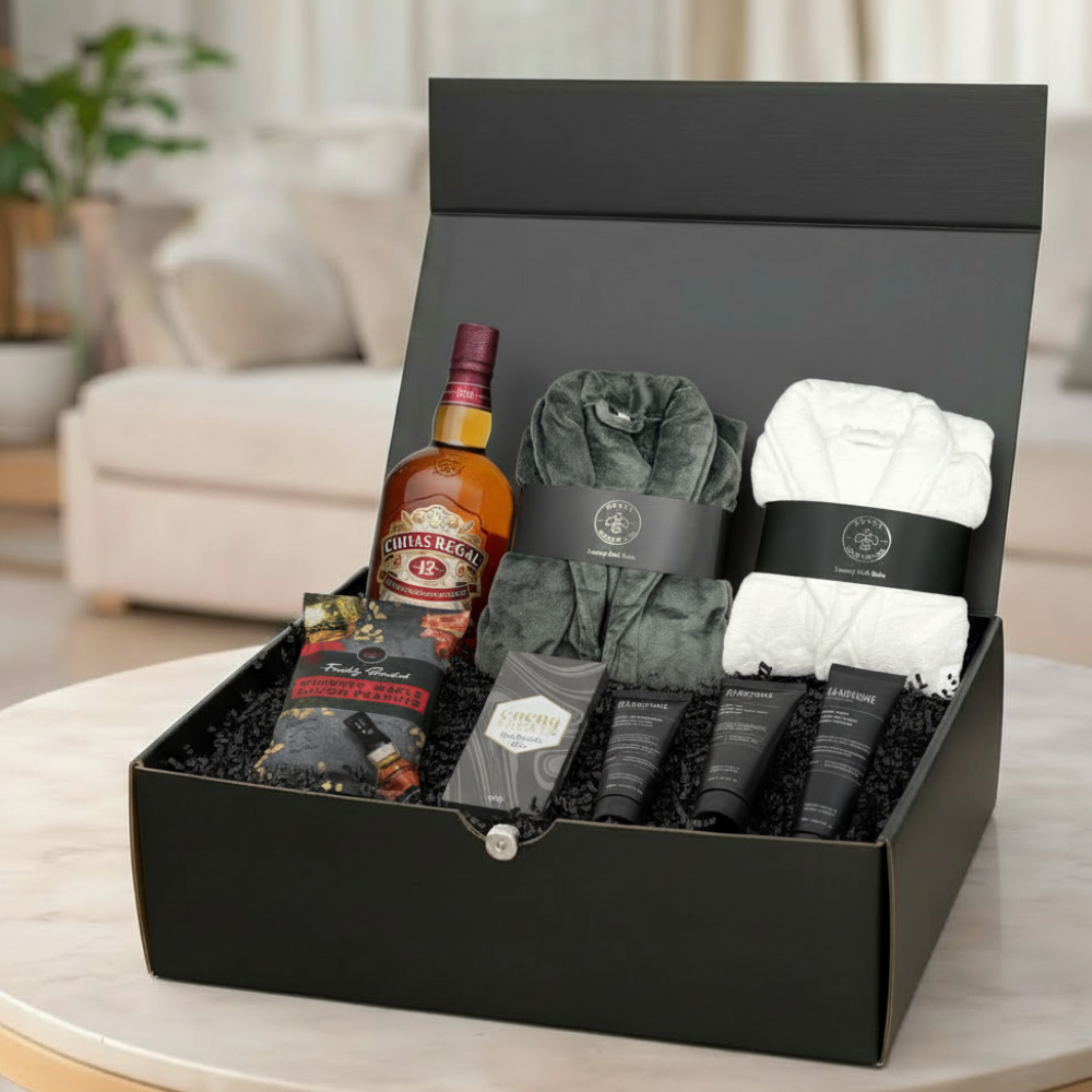Give him the gift of a leisurely day with a luxurious bathrobe and delicious snacks. There's nothing better than relaxing and indulging in some treats. Wish him a wonderful day and let him unwind! This gift is perfect for anyone who appreciates fine things like Chivas. Send it to Dad, Grandad, Hubby, or any man who deserves a break