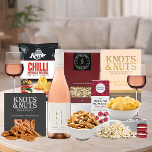 This is the prefect gift to brighten her day with. Enjoy this beautiful snack hamper featuring Chapel Hill Abacus Rosé. Filled with snacks from raspberry mini melting moments to Salted pretzels and nuts, this gift will be much loved. Spoil her with all the nibbles she loves. The perfect gift for your next celebration!