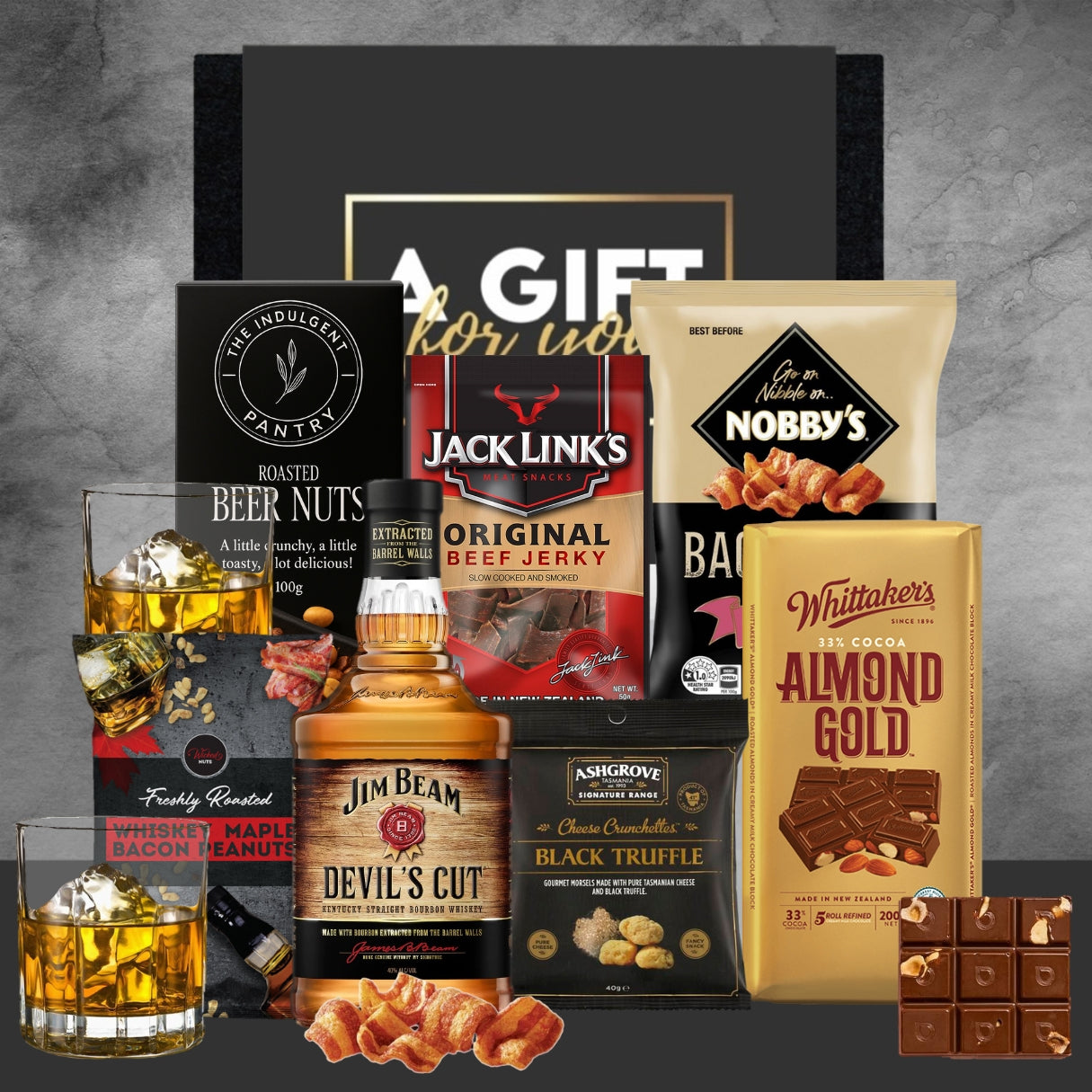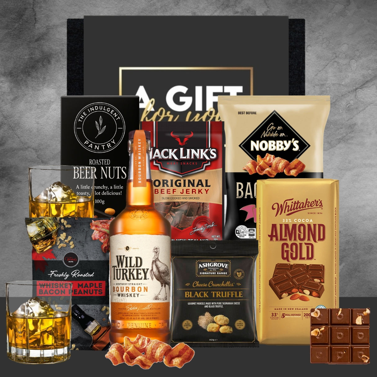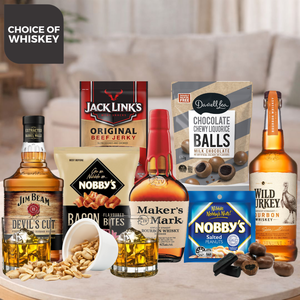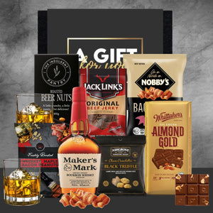 He's stylish, cool, handsome, funky... even if he's the only one that thinks it! He deserves a great gift to celebrate him and this gift hamper is a perfect combination of snacks and his choice of bourbon. Because he'll never go out of style!