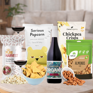 The hamper includes a selection of organic snacks designed to complement the Shiraz perfectly. From Ceres Organics Turmeric & Black Pepper Chickpea Crisps to Serious Food Co Sweet & Salty Popcorn, each snack is thoughtfully selected for its health benefits and bold flavors.