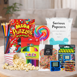 Puzzles, pencils, and popcorn—this boys' hamper is a treasure trove of fun for the colorful, creative kids in your life. With a mix of exciting activities and delicious snacks, this pirate-themed hamper brings the adventure right to their doorstep. It's a pirate's celebration, complete with everything they need for hours of entertainment.